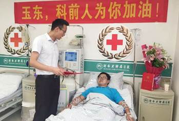 | ? ? 6月19日上午,一場生命接力的捐獻在河南省腫瘤醫(yī)院順利完成。為了救助一名在山東住院的白血病患者,來自武漢科前生物股份有限公司的張玉東,全身換血一周半,流通血液12000ml,其血液被專業(yè)設(shè)備分離出干細胞300ml,這些“生命的種子”將立即從鄭州送往濟南。捐獻后,張玉東身體狀況良好。